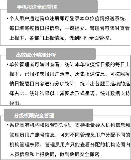 新型肺炎应急管理上报系统是全民防控疫情形势下重点单位管理者应急管理、精准防控的高效工具。即能有效缓解各级统计人员焦虑低效的工作状态,节省精力提高效能,也让管理者分级掌控数据权限,精准到人,杜绝“一问三不知”管理盲区,真正实现压紧压实主体责任,切实达到“横到边纵到底”统计排查掌控效果,为决策者提供科学决策数据支撑。