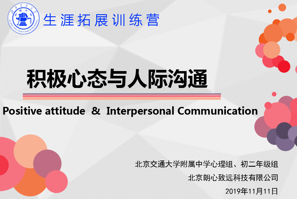 11月11日,北京交通大学附属中学初二年级的同学们共同迎来了一场精彩生动的生涯拓展训练营活动。本次活动以“积极心态与人际沟通”为主题,旨在让我们学会如何思考和理解他人的情绪、情感;怎样和他人更积极地沟通、合作。本次活动由心理组精心策划,心理组和初二年级组共同组织,北京朗心致远科技有限公司承办。