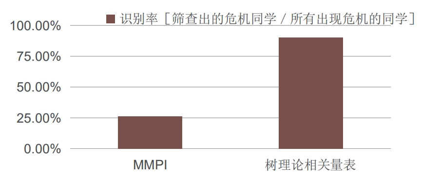 很多心理中心还发现,测评量表对高危个案的识别率太低。某高校曾对危机干预个案进行评估,最后真正出现危机情况(自杀或者攻击他人倾向或者行为未遂)的个案有42起。在这42起当中,使用传统的MMPI量表进行筛查,只筛查出11个人,识别率占26.2%。而通过心云系统(心云心理健康信息化管理平台V3.0简称)的相关测评量表复查出了38人,识别率提高到了90.5%,心云系统的测评量表对高危个案的识别率是很高效的。
