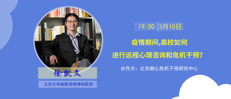 3月10日晚19:00,北京朗心危机干预研究中心邀请北京大学副教授、精神科医生徐凯文博士,为大家讲授“疫情期间,高校如何进行远程心理咨询和危机干预”。此次直播课受到全国各地高校教师的一致肯定,听课人数高达到4000多人次。在课程中,徐凯文副教授对高校教师提出的一系列问题悉心回答,给出了许多的宝贵建议。课后老师们对徐凯文副教授的讲授表示感谢,表示这次课程真是一场“及时雨”。