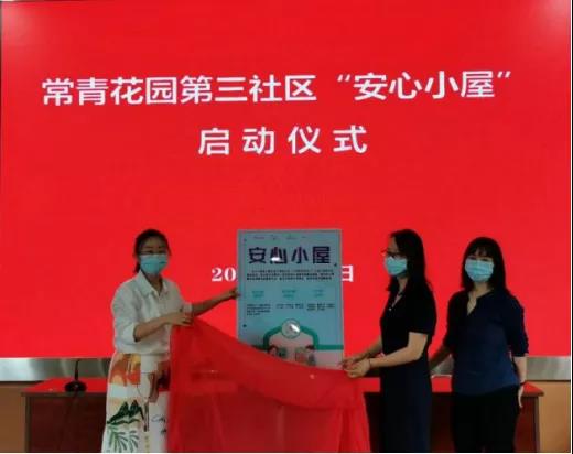 (中国社会工作联合会“心社联动送安心”项目副主任魏悦,中国科学院心理研究所助理研究员韩茹,常青花园社区管理办公室副主任薛蓉为“安心小屋”揭牌)
