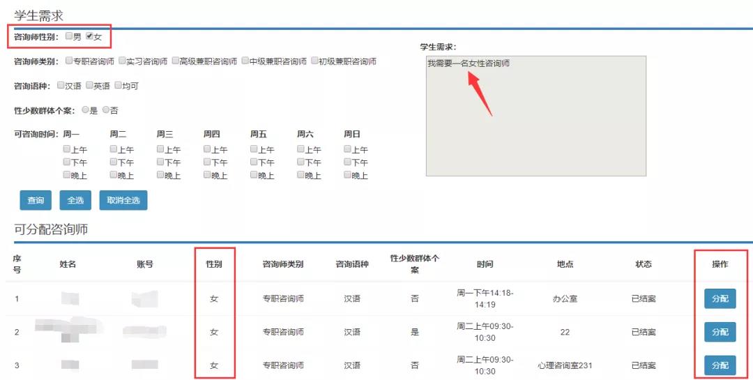 有了专业的初始访谈,在咨询师匹配环节,系统在3.0版本中也对咨询师分配进行了进一步完善,系统能够自动按照来访的预约时间、初始访谈时间相应顺序以及初始访谈结果重新排序呈现待分配的同学名单,也通过咨询师信息的录入在分配时为分配老师自动提供需要的信息、以便线上完成分配工作。