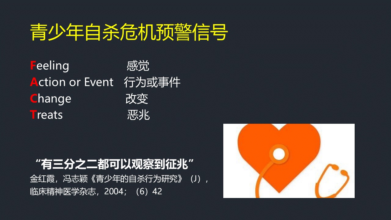 3、识别自杀的危险信号,及时有效地按照指南进行处理,避免恶性后果。