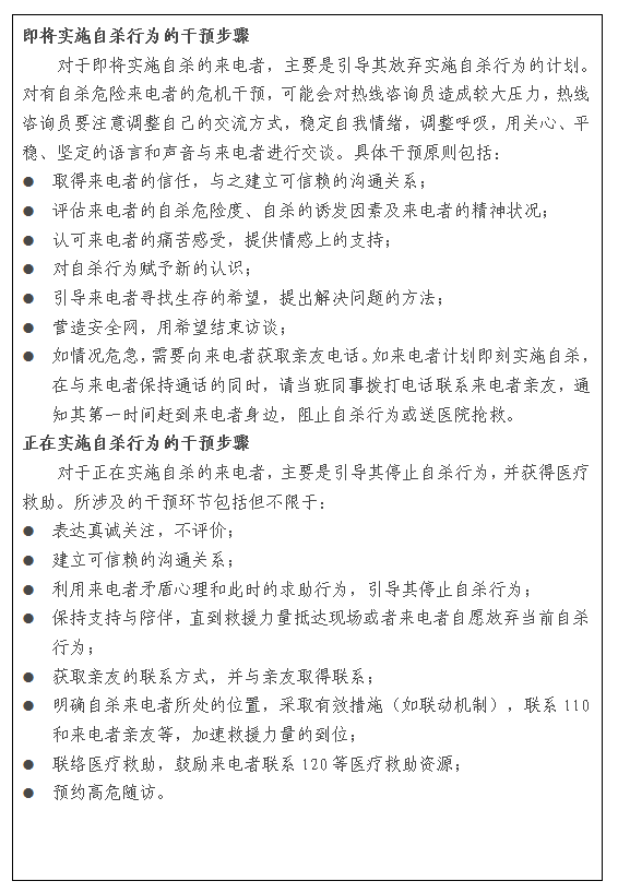 (二)有自杀风险来电的干预流程如果来电者流露出较强的负面情绪(如痛苦、绝望、抑郁、焦虑等),热线咨询员要对来电者进行自杀风险的研判;如评估为高危来电者,立即进行危机干预。自杀风险包括对自杀想法、自杀计划、自杀未遂史和亲友自杀史等的评估,评估时要表现出专业、自然、冷静。