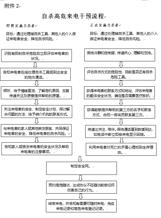 4.如评估来电者有高度自杀风险,热线咨询员需要根据来电者具体情况,快速反应,提供个体化的心理危机干预。原则上,高危来电处理如遇特殊情况可适当延长咨询时间,但不宜过长。