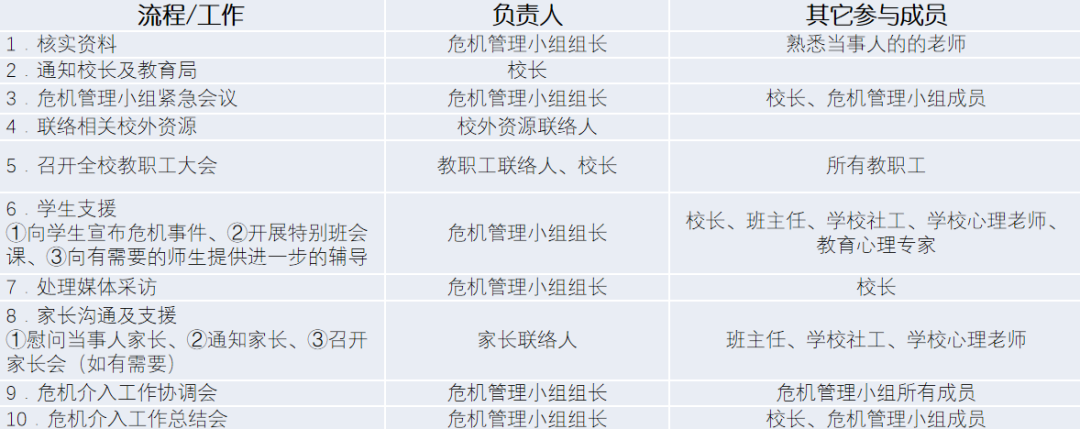 结合不同人员职责,学校心理危机管理小组在处理危机事件时的具体工作流程如下: