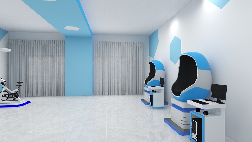 装修建议:墙面采用浅蓝色乳胶漆、配合科技线条设计,营造科学、科技的放松训练场景;地面铺设防滑地垫,防止滑倒。
