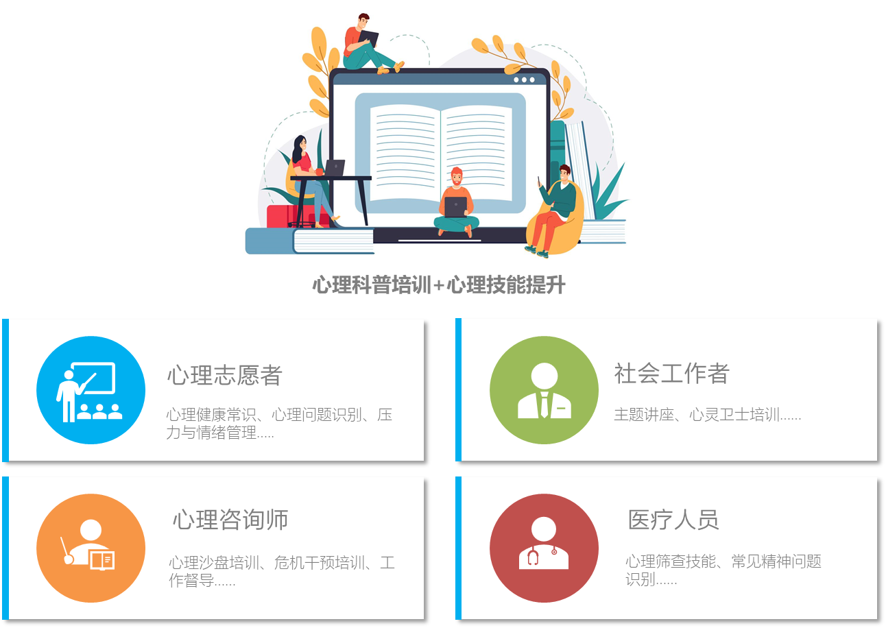 朗心可为政府提供心理科普培训、心理技能提升两项专业心理培训服务,助力政府心理专业人才队伍建设,将心理志愿者、社会工作者、心理咨询师、医疗人员四类人群集中培训,从整体提升全市心理健康服务水平,为社会心理服务体系建设储备人才资源。