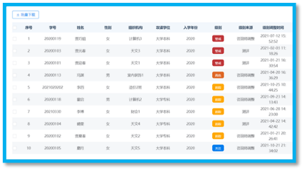 平台具有综合查询、预警分析功能,心理老师可根据测评结果将学生心理状态划分为“警戒、高危、追踪、关注、正常”五个等级,从而帮助学院进行风险预警、预防危机事件发生。