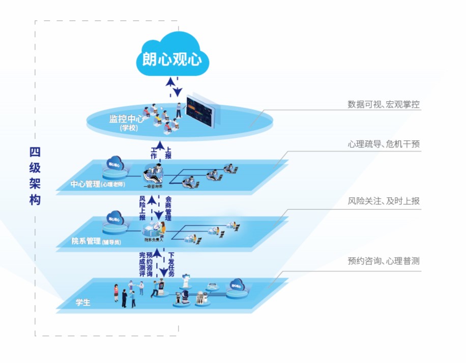 朗心观心平台基于树理论、空心病理论、大数据等技术研发,主要用于高校心理危机干预和心理信息化管理。平台具有四级架构,可完成班级、院系、中心、学校协同工作,包含心理测评、智能方案、预约咨询、心理咨询、危机干预、危机库管理、心理周月报、特殊案例上报、会商管理等功能,学生可通过平台提高核心素养,心理委员、辅导员、院系书记、心理咨询师、学校管理者可通过平台协同、智能管理,且平台通过智能物联技术可与硬件设备进行数据对接,完成一站式软硬件管理和数据集中、智能分析。