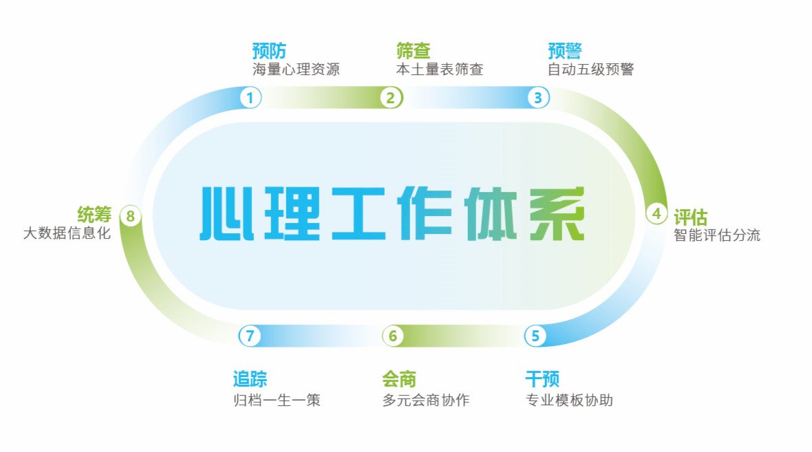 平台基于专业知识与智能设计,可以帮助学校开展日常心理工作、建立危机防控体系,心理工作实现闭环管理,8个工作紧密联动,提高效率。