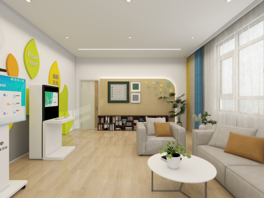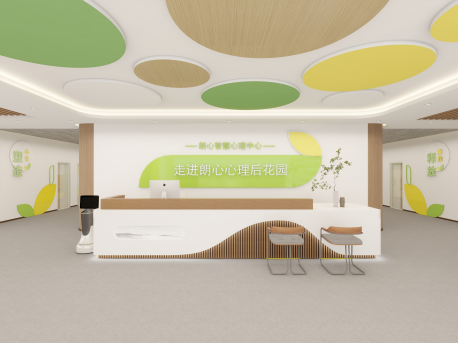 装修建议:墙面采用浅色系乳胶漆,挂心理挂图或标语,鼓舞来访人员进入训练;地板采用浅色系地毯,干净整洁、易于打扫。