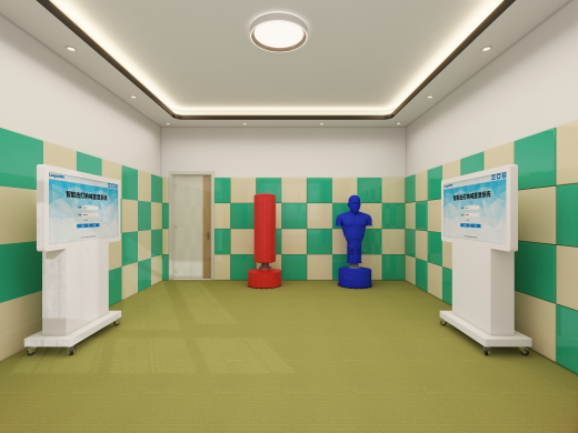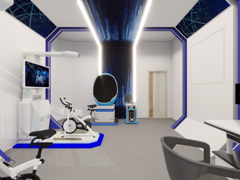 装修建议:墙面采用浅蓝色乳胶漆、配合科技线条设计,营造科学、科技的放松训练场景;地面铺设防滑地垫,防止滑倒。