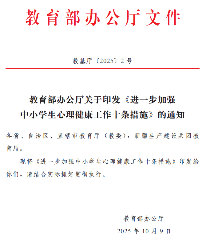 近日,教育部办公厅印发了《进一步加强中小学生心理健康工作十条措施》(教基厅〔2025〕2号)。小朗根据政策内容总结出,核心举措系统集成了预防、干预与保障三个维度: