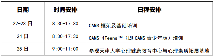 (2)CAMS-4Teens™(即CAMS青少年版)培训:CAMS青少年版专门用于青少年自杀风险的管理,并鼓励家长参与干预过程。该部分将讲解和示范如何在与青少年个案及其家长工作时使用CAMS,预计用时1天。