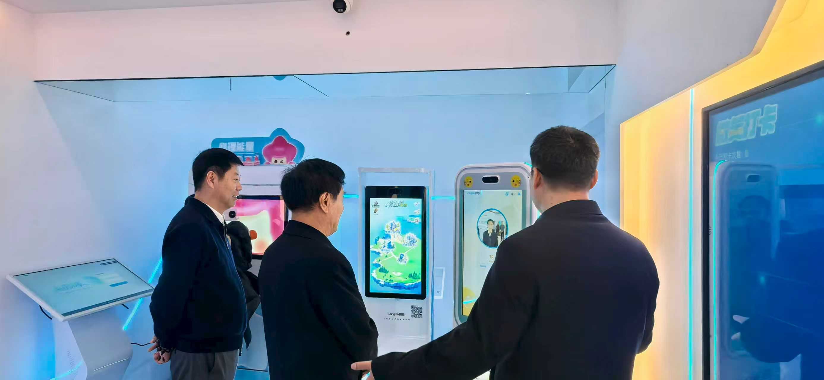 参观过程中,考察组深入了解朗心在心理健康科技领域的实践成果。王富主任与孔凡明秘书长亲自体验多款智能心理设备,并与一线产品经理深入交流。领导们对朗心将技术研发与心理健康服务实际需求紧密结合的模式表示高度认可,认为其切实回应了当前学校心理健康工作的迫切需求。