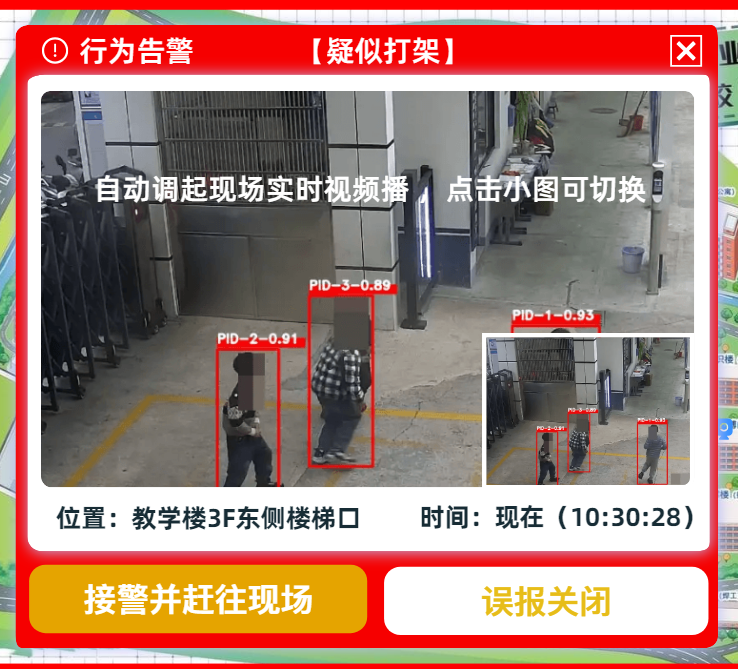 分级预警,精准推送: 内置事件分类与分级规则引擎,一旦发现风险,系统立即判定等级,并通过APP、短信等多渠道,将告警信息与现场画面同步推送至安保、值班领导等责任人。
