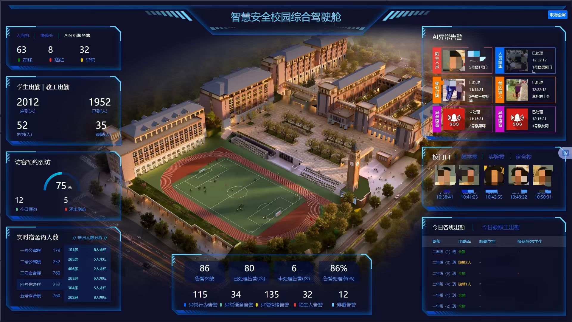 学校层面: 实时告警中心、安全治理仪表盘(闭环率、高发风险点统计)、领导任务看板,让安全管理一目了然。