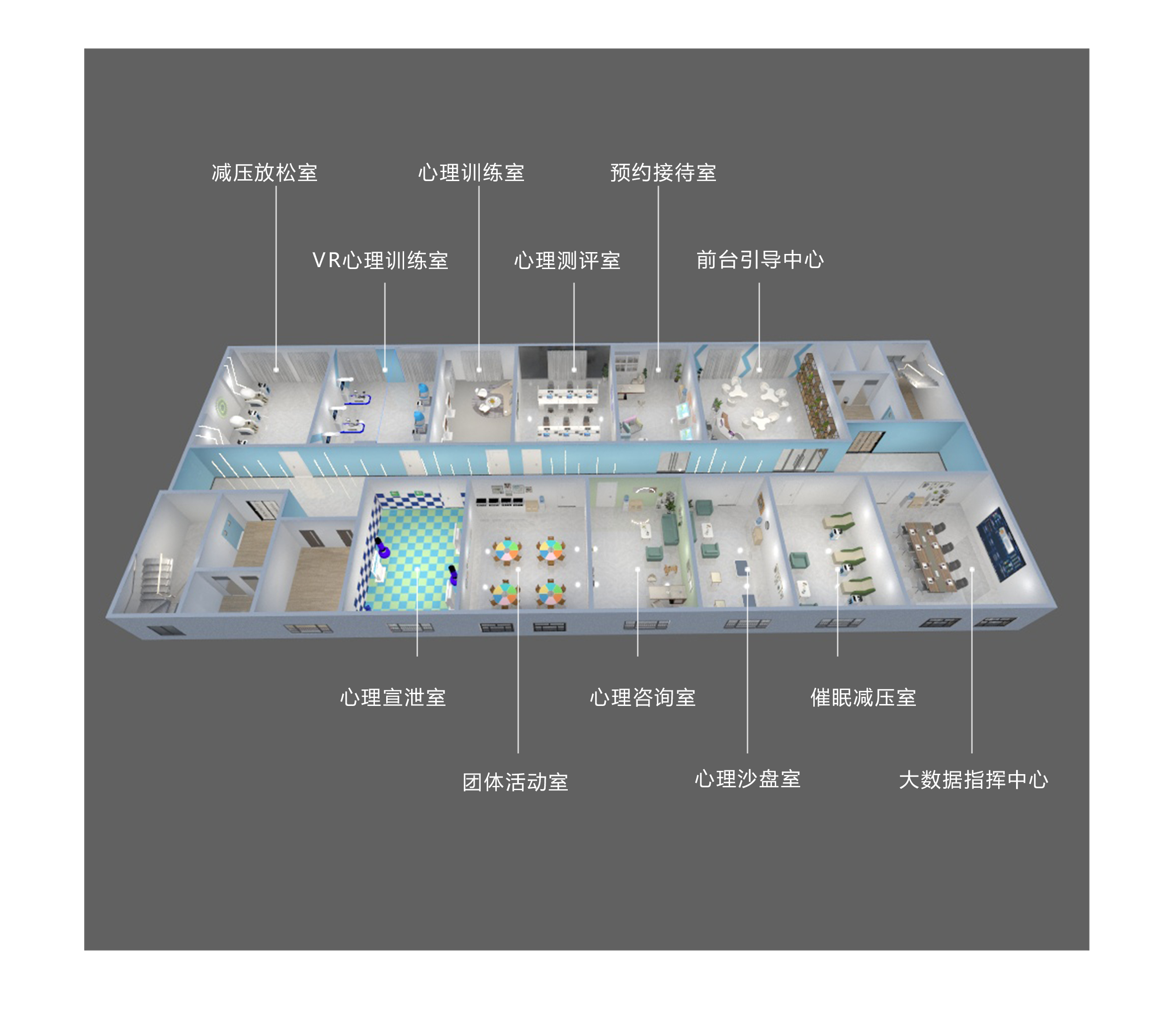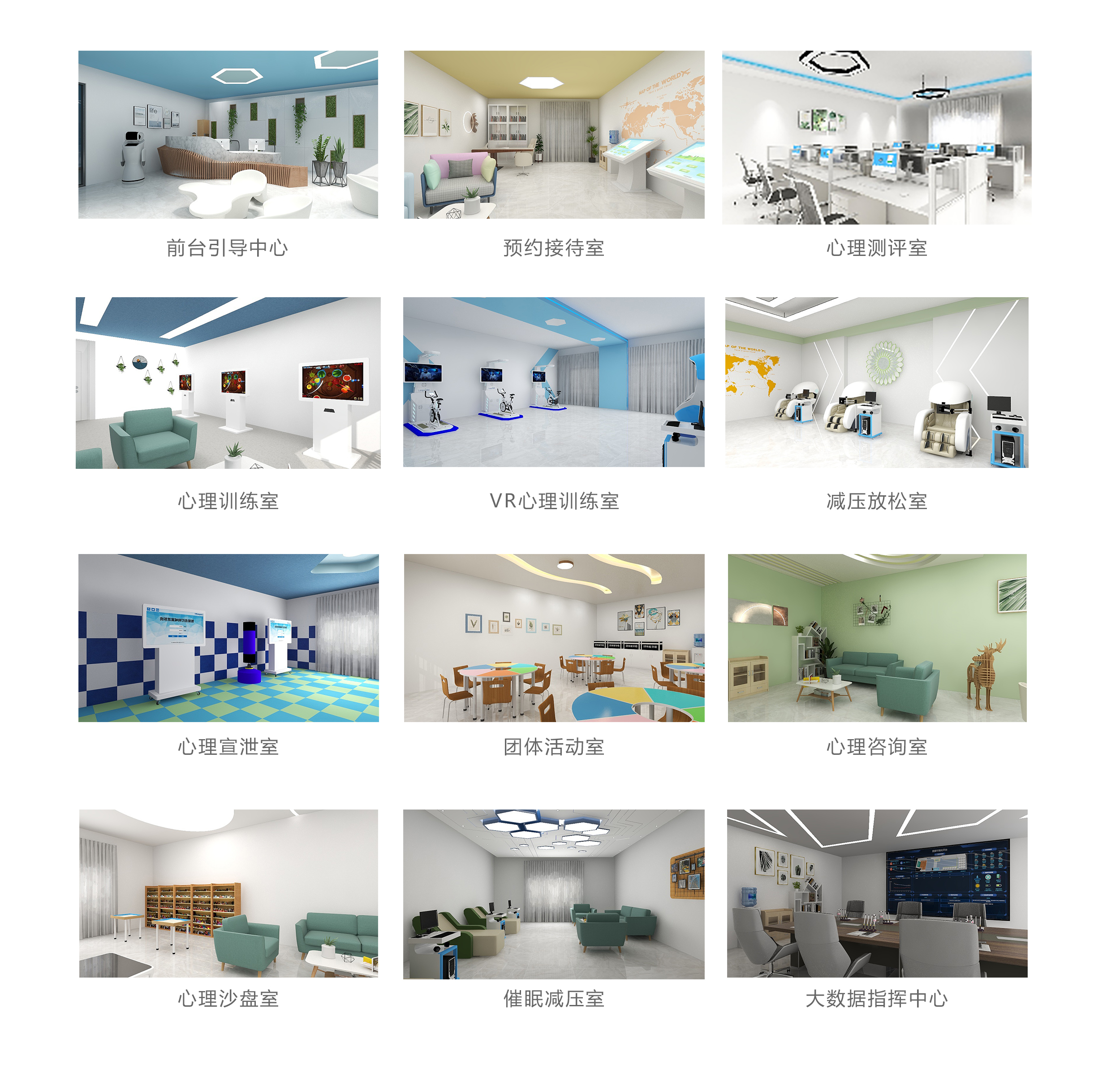 朗心根据心理专业理论、多年建设经验,为用户提供“两大中心十大场室”一站式心理空间建设,帮助用户建立全方位、智能化的大数据心理健康服务中心。